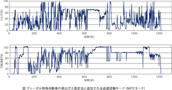 ディーゼル特殊自動車の排出ガス試験として、現行の定常モード試験(8 モード法)に加えて、今後採用が想定される排気後処理装置の効果を適切に評価できるように、世界統一基準に規定されている過渡試験モード(NRTC モード)を追加します。